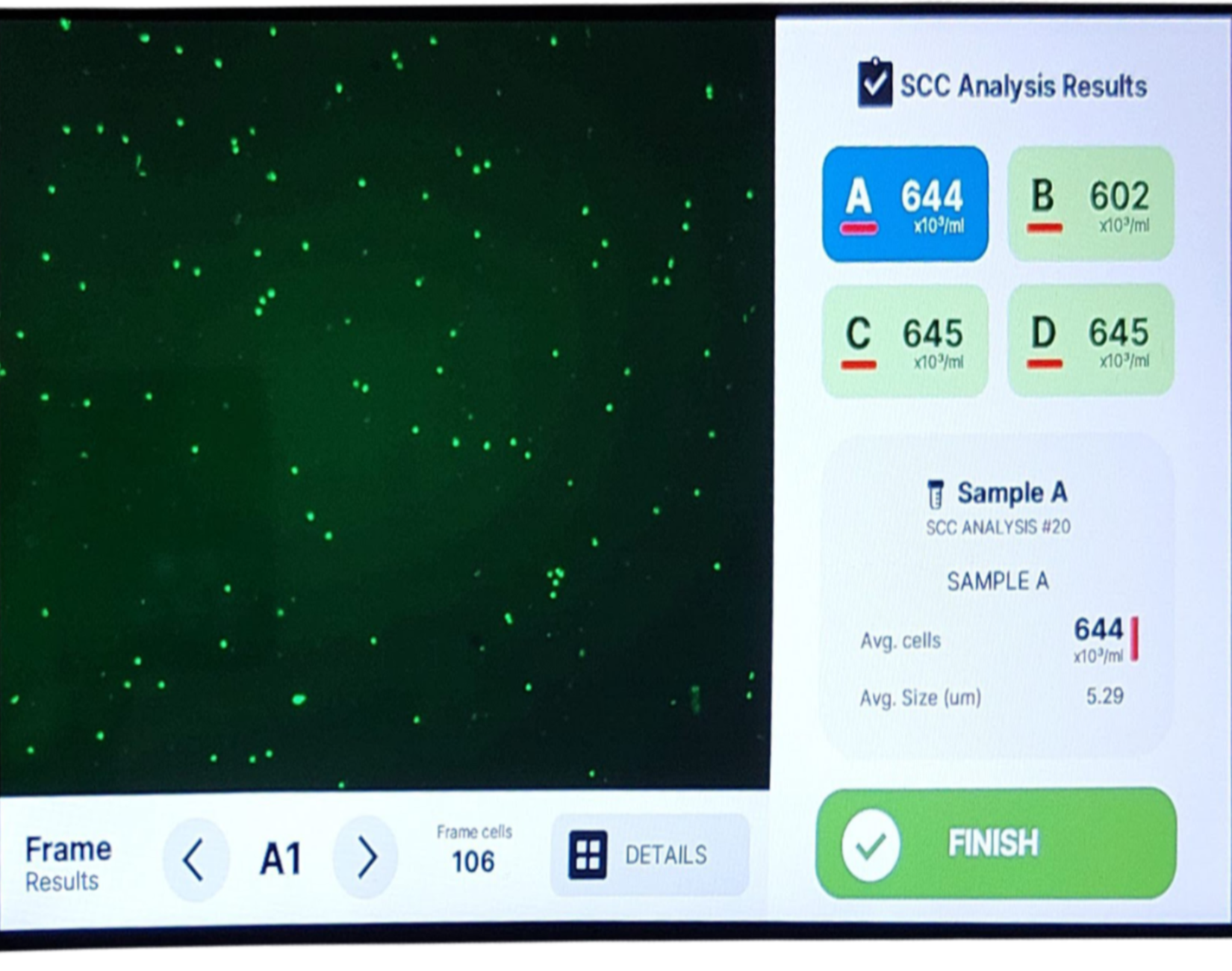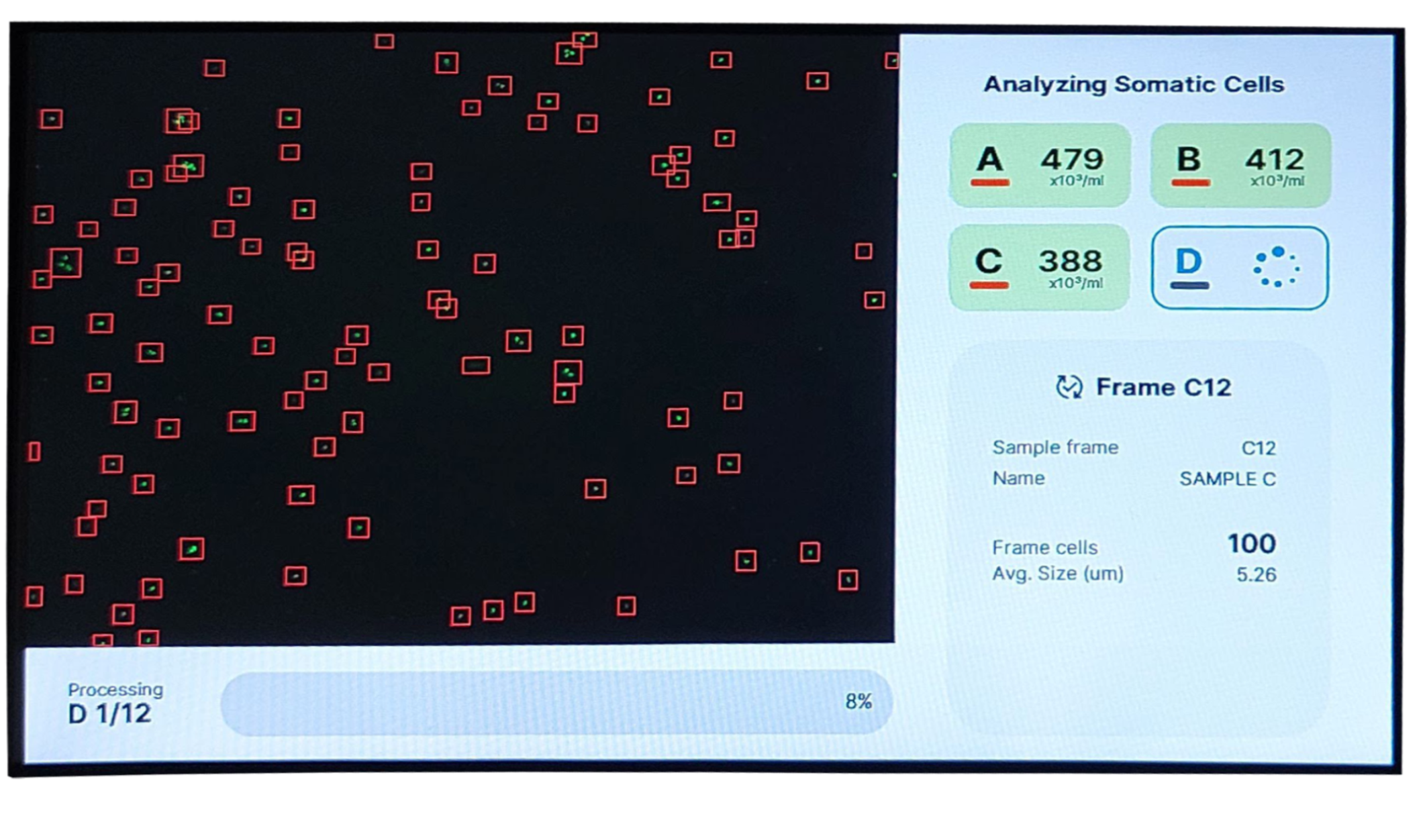 - Recuento totalmente automatizado y preciso de células somáticas en muestras de leche teñidas.